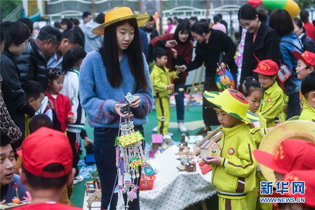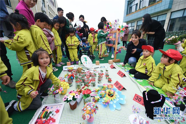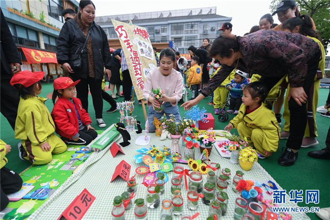 當(dāng)日,浙江省長興縣畫溪街道包橋中心幼兒園舉辦校園義賣節(jié)。10多個攤位上擺放著家長和孩子一起用廢舊的玻璃瓶、雪糕棍、紙盒、紐扣等廢舊材料制作而成的小木屋、迷你小盆栽、紐扣花束、風(fēng)車等手工作品,孩子們以班級為單位進(jìn)行手工作品義賣,所得款項(xiàng)將全部用于社區(qū)公益環(huán)?;顒?。主辦方介紹,希望通過這樣的活動,倡導(dǎo)廢物利用和綠色低碳的生活理念。
