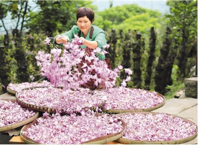 近日,貴州省赤水市的金釵石斛花陸續(xù)進(jìn)入盛花期。據(jù)了解,金釵石斛是一種名貴中藥材,有“仙草”之稱。近年來(lái),赤水市多個(gè)鄉(xiāng)鎮(zhèn)積極推進(jìn)農(nóng)業(yè)與鄉(xiāng)村旅游等產(chǎn)業(yè)融合,采取“合作社+支部+農(nóng)戶”模式,鼓勵(lì)農(nóng)民種植金釵石斛,助力脫貧攻堅(jiān)和鄉(xiāng)村振興。圖為一名當(dāng)?shù)剞r(nóng)婦在晾曬剛采摘的金釵石斛鮮花。王長(zhǎng)育攝(新華社發(fā))