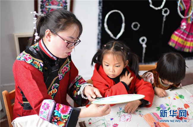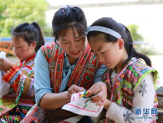 5月14日,在畢節(jié)市黔西縣協和鎮(zhèn)立新村立新小學,孩子在老師的指導下練習刺繡。新華社發(fā)(周訓超 攝)