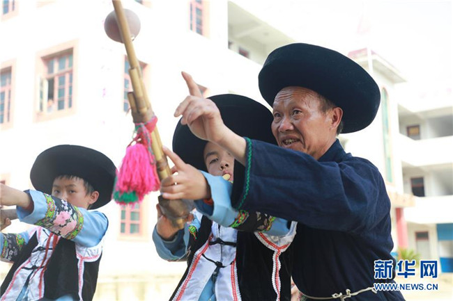 5月14日,在畢節(jié)市黔西縣協和鎮(zhèn)立新村立新小學,老師在指導學生學習蘆笙。新華社發(fā)(周訓超 攝)