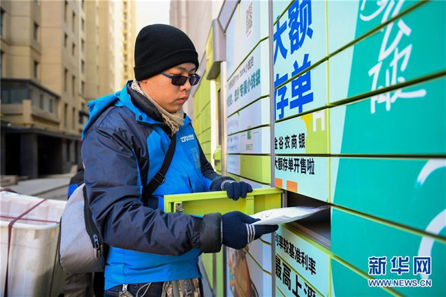 內(nèi)蒙古呼和浩特中通快遞新華東街分部的快遞員程泓毅向快遞柜中投放包裹(1月23日攝)。新華社記者 彭源 攝