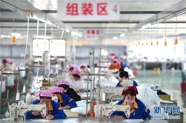 5月16日,鹽山縣慶云鎮(zhèn)村民在凱瑞斯服裝廠工作。該服裝廠總部位于雄安新區(qū)容城縣,為配合雄安新區(qū)產(chǎn)業(yè)轉(zhuǎn)型升級(jí),于2018年初來到河北省鹽山縣開設(shè)工廠。 新華社記者 邢廣利 攝