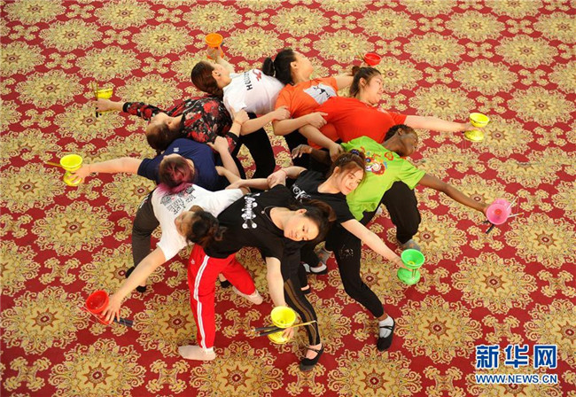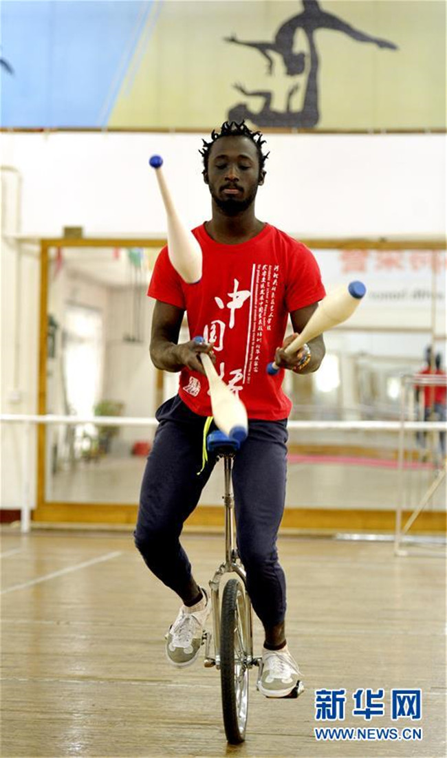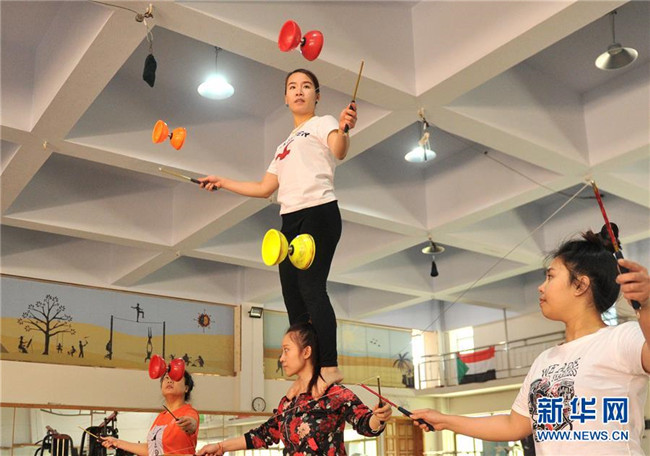 5月20日,在吳橋雜技藝術(shù)學校,留學生練習雜技。新華社發(fā)(苑立偉 攝)