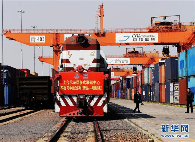 齊魯號中歐班列(青島—明斯克)從位于青島的中國—上海合作組織地方經(jīng)貿(mào)合作示范園發(fā)車(4月2日攝)。新華社記者 李紫恒 攝