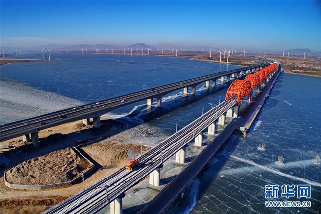 中鐵三局的工人在京張高鐵官廳水庫特大橋進(jìn)行鋪軌作業(yè)(2019年1月13日無人機(jī)拍攝)。新華社記者 楊世堯 攝