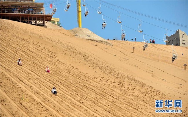 游客在寧夏中衛(wèi)市沙坡頭旅游景區(qū)游玩。沙坡頭旅游景區(qū)因地制宜發(fā)展沙漠旅游,旺季日接待游客量達(dá)兩萬(wàn)人次(2018年8月22日攝)。 新華社記者 劉軍喜 攝