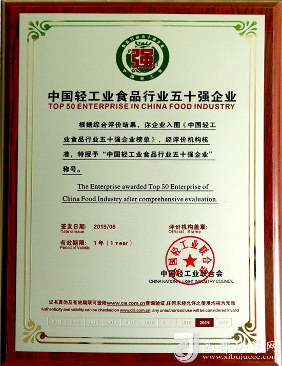近日,由中國輕工業(yè)聯(lián)合會主辦,主題為“強(qiáng)化科技創(chuàng)新,服務(wù)美好生活”的“中國輕工業(yè)百強(qiáng)企業(yè)高峰論壇”在北京召開。會上,中國輕工業(yè)聯(lián)合會公布了2018年度中國輕工業(yè)食品行業(yè)五十強(qiáng)企業(yè),西鳳股份公司憑借良好的發(fā)展業(yè)績、市場口碑、行業(yè)競爭力及日益增強(qiáng)的品牌影響力,被中國輕工業(yè)聯(lián)合會授予“中國輕工業(yè)食品行業(yè)五十強(qiáng)企業(yè)”榮譽(yù)稱號,并受到表彰獎勵。