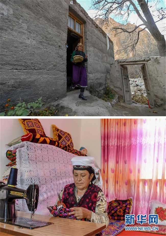 拼版照片:上圖為大同鄉(xiāng)庫(kù)如克欄桿村村民海熱尼莎·薩木薩克拿著馕走出老房子(2018年11月11日攝);下圖為在新疆塔什庫(kù)爾干塔吉克自治縣塔提庫(kù)力易地扶貧搬遷安置點(diǎn)新居內(nèi),海熱尼莎在做針線(xiàn)活(2019年6月26日攝)。新華社記者胡虎虎攝