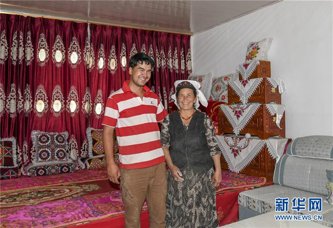 這是在新疆塔什庫(kù)爾干塔吉克自治縣大同鄉(xiāng)的一處易地扶貧搬遷安置點(diǎn)安居房?jī)?nèi)拍攝的古力西爾汗·阿迪那買(mǎi)買(mǎi)提與母親的合影(6月18日攝)。他家已于2018年脫貧。新華社記者胡虎虎攝