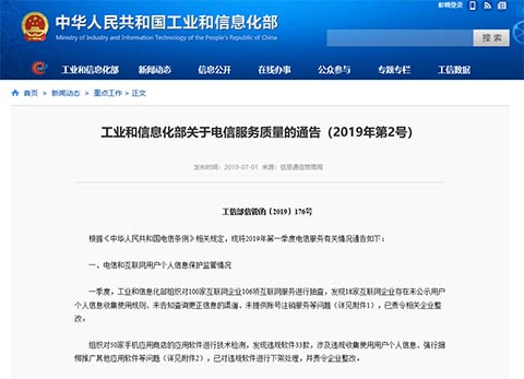 通告稱,一季度,工信部對100家互聯(lián)網(wǎng)企業(yè)106項互聯(lián)網(wǎng)服務進行抽查,發(fā)現(xiàn)18家互聯(lián)網(wǎng)企業(yè)存在未公示用戶個人信息收集使用規(guī)則、未告知查詢更正信息的渠道、未提供賬號注銷服務等問題,工信部已責令相關(guān)企業(yè)整改。