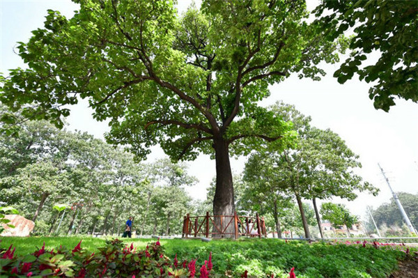游客從蘭考焦裕祿干部學(xué)院門(mén)口的“焦桐”下走過(guò)(2017年8月9日攝)。這棵泡桐是焦裕祿當(dāng)年親手種下,被人們稱為“焦桐”。