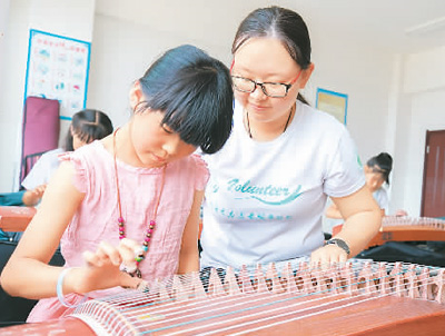 圖為志愿者指導(dǎo)實(shí)驗(yàn)小學(xué)鄉(xiāng)村少年宮孩子們練習(xí)古箏。(來源:人民圖片)