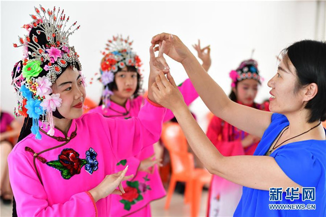 7月16日,小朋友們?cè)跒粗菔凶詮?qiáng)里社區(qū)活動(dòng)室學(xué)習(xí)評(píng)劇。 新華社記者 牟宇 攝