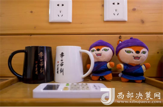 華山文創(chuàng)馬克杯、和“華山吾俠”毛絨公仔點(diǎn)綴在桌上,簡單明快的這一小片區(qū)域都像是在敘述華山論劍的故事。