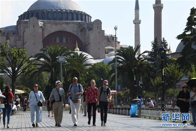 這是7月6日,在土耳其伊斯坦布爾,游客在阿亞索菲亞博物館附近游覽。新華社記者 徐速繪 攝