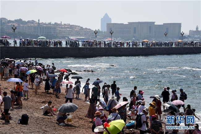 8月6日,游客在青島棧橋景區(qū)海邊游玩。 暑期旅游旺季,海濱城市青島各景區(qū)、景點游人如織。 新華社記者 李紫恒 攝