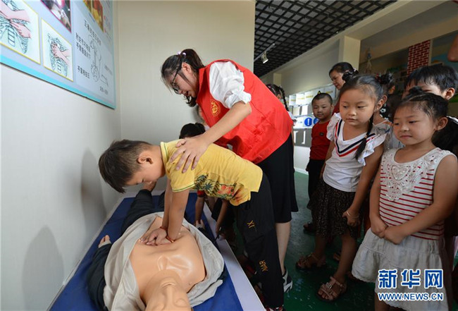 8月8日,在汶上縣劉樓鎮(zhèn)安全教育體驗基地,小朋友在工作人員指導(dǎo)下學(xué)習(xí)心肺復(fù)蘇技巧。