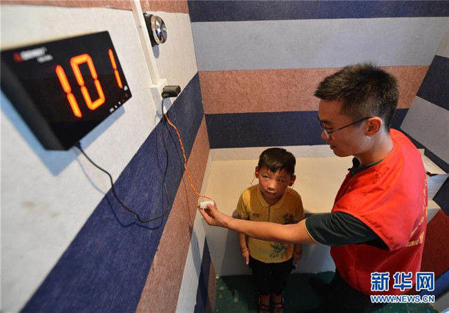 8月8日,在汶上縣劉樓鎮(zhèn)安全教育體驗基地,小朋友在工作人員幫助下體驗噪聲污染。