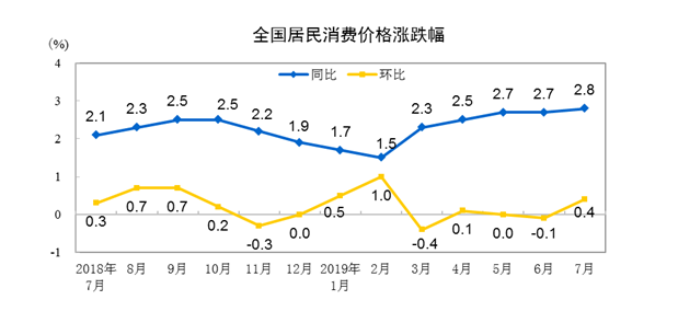 記者從國家統(tǒng)計局獲悉,2019年7月份,全國居民消費價格同比上漲2.8%。其中,城市上漲2.7%,農(nóng)村上漲2.9%;食品價格上漲9.1%,非食品價格上漲1.3%;消費品價格上漲3.4%,服務(wù)價格上漲1.8%。1??—7月平均,全國居民消費價格比去年同期上漲2.3%。