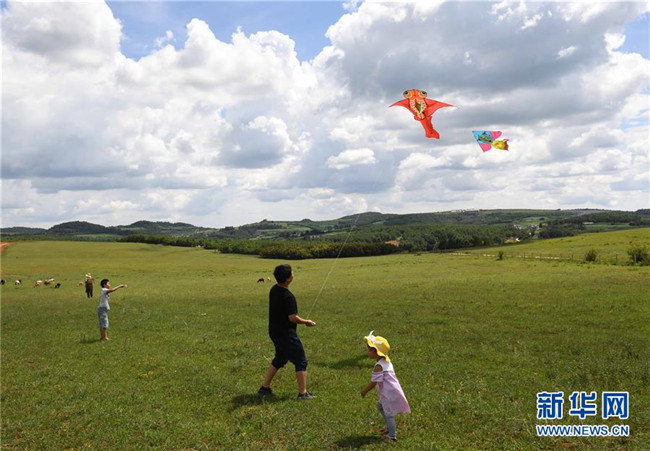 8月10日,游人在云南尋甸北大營草場放風箏。 新華社記者楊宗友攝