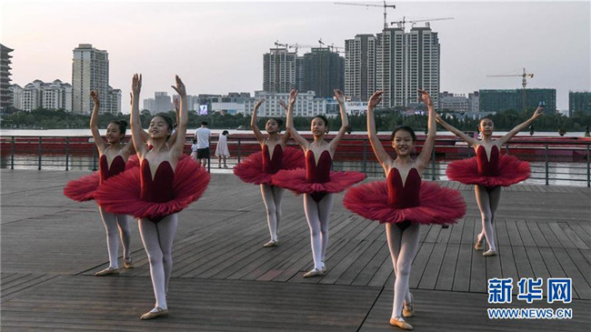 8月7日黃昏時,芭蕾小天使們在欽州市白石湖公園排練(視頻截圖)。新華社記者 張愛林 攝
