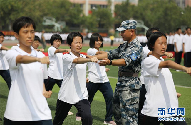 8月27日,河北省衡水市第二中學高一新生在教官指導下進行軍訓。