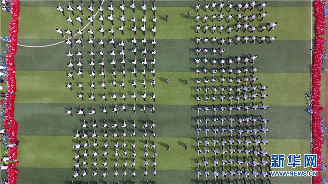8月27日,河北省衡水市第二中學高一新生進行入學軍訓(無人機拍攝)。新華社記者朱旭東攝