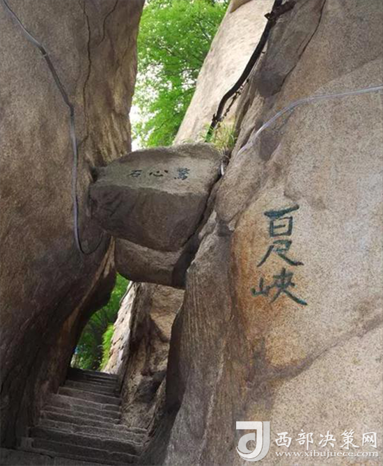 出千尺㠉不遠(yuǎn)是百尺峽,這里是登山第二道險(xiǎn)關(guān)。兩壁高聳,中間夾有一塊從天而降的巨石,上刻“驚心石”三個(gè)大字,游人要從石下小路穿過(guò),確實(shí)驚心動(dòng)魄。此后還有仙人橋、俯渭崖、黑虎嶺等小險(xiǎn)處,就到了登山第三道險(xiǎn)關(guān)老君犁溝,這是夾在陡峭石壁之間的一條溝狀險(xiǎn)道,深不可測(cè),有石階570有余。