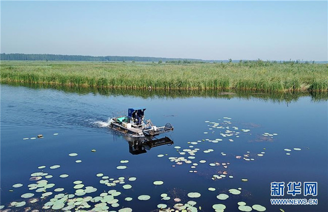 一艘打撈船在白洋淀景區(qū)內清理漂浮物(8月31日無人機拍攝)。新華社記者 牟宇 攝