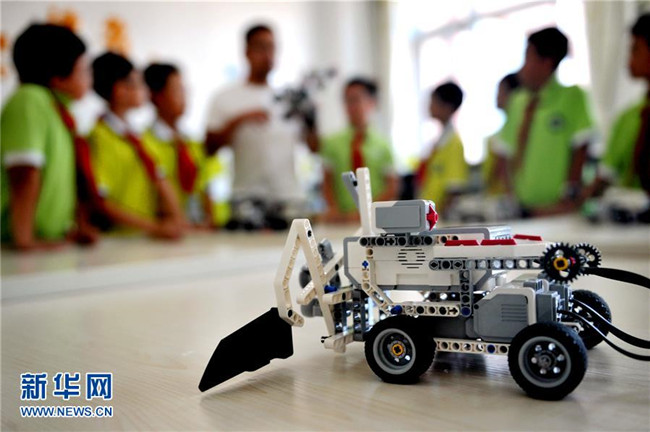 9月5日,在承德市雙橋區(qū)東園林小學(xué),學(xué)生在老師的指導(dǎo)下學(xué)習(xí)機(jī)器人知識。