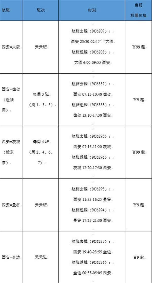 據(jù)了解,此次新開(kāi)的航線及加密航線,將從2019年10月27日起陸續(xù)開(kāi)始執(zhí)行,執(zhí)飛機(jī)型為空客A320。開(kāi)航初期,機(jī)票價(jià)格相對(duì)優(yōu)惠,從春秋航空官網(wǎng)查詢到的價(jià)格來(lái)看,西安飛大阪、茨城(近東京)99元起(不含稅),西安飛佐賀(近福岡)、曼谷、金邊低至9元起(不含稅)。