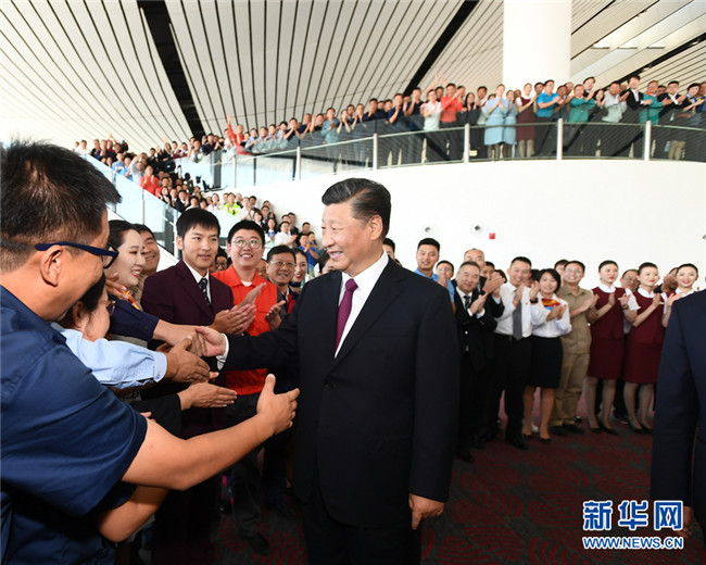 9月25日上午,北京大興國際機場投運儀式在北京舉行。中共中央總書記、國家主席、中央軍委主席習近平出席儀式,宣布機場正式投運并巡覽航站樓。這是習近平看望參與機場建設(shè)和運營的工作人員代表,同他們親切交談。 新華社記者 謝環(huán)馳 攝