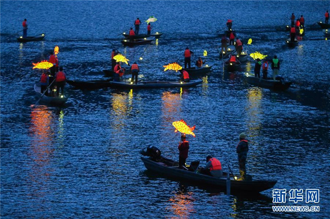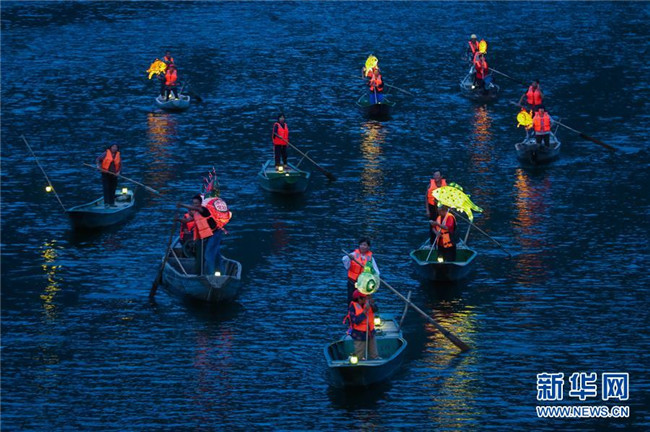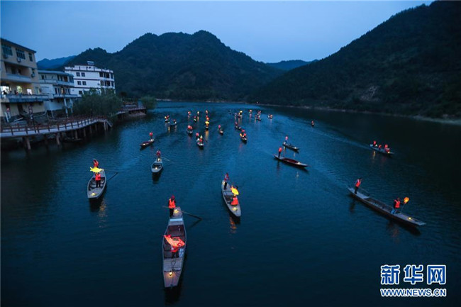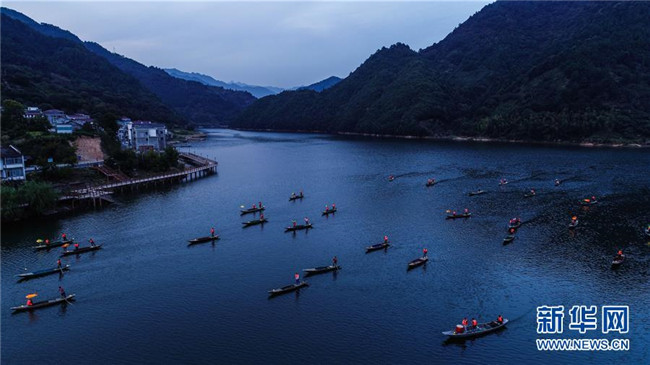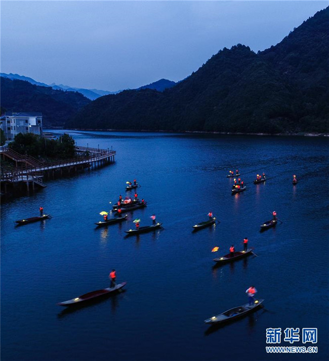 9月25日,在宋村鄉(xiāng)云源港的水面上,漁民劃著漁船,船頭點亮漁燈,構(gòu)成一幅“漁舟唱晚、萬家燈火”的美麗圖景,與沿湖民宿群落交相輝映(無人機拍攝)。