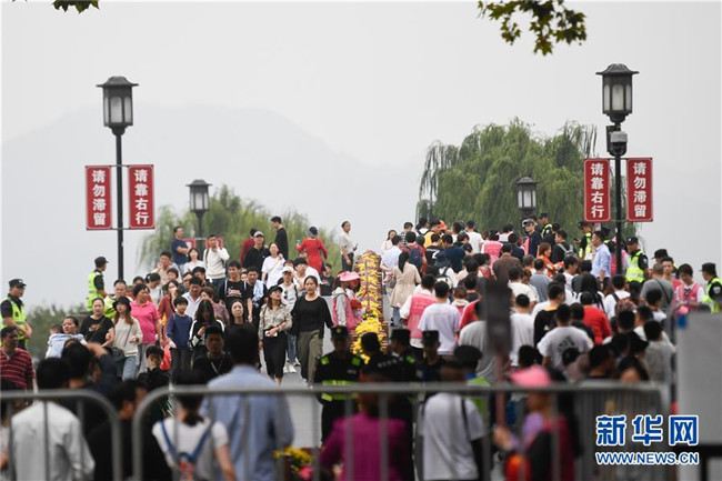 10月7日,杭州西湖風(fēng)景區(qū)的斷橋上游人絡(luò)繹不絕。經(jīng)文化和旅游部綜合測(cè)算,2019年國(guó)慶七天全國(guó)共接待國(guó)內(nèi)游客7.82億人次,同比增長(zhǎng)7.81%;實(shí)現(xiàn)國(guó)內(nèi)旅游收入6497.1億元,同比增長(zhǎng)8.47%。新華社記者 黃宗治 攝