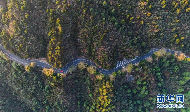 車輛行駛在通往廬山風(fēng)景區(qū)的北山公路上(10月9日無人機拍攝)。新華社記者 胡晨歡 攝