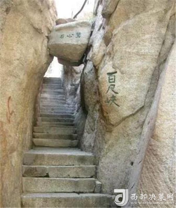 出千尺幢不遠(yuǎn)是百尺峽,這里是登山第二道險(xiǎn)關(guān)。雖沒(méi)有千尺幢那么長(zhǎng),僅46米,石階91級(jí),但仍是華山天險(xiǎn)之一。這里勢(shì)危坡陡,石壁峭立,通道狹窄,且有懸石,搖搖欲墜。游人至此都心驚膽顫。明顧端木有詩(shī)狀其險(xiǎn)曰:"幢去峽復(fù)來(lái),天險(xiǎn)不可瞬。雖云百尺峽,一尺一千仞。"千尺幢、百尺峽的臺(tái)階都是從明末清初開始鑿的,民國(guó)時(shí)幾經(jīng)加固,解放后又多次修整,一九八五年又鑿復(fù)道,游人上下各行其道。