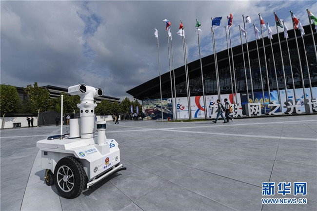 這是互聯(lián)網(wǎng)之光博覽會(huì)場(chǎng)館外巡邏的5G警用機(jī)器人(10月18日攝)。 新華社記者 徐昱 攝