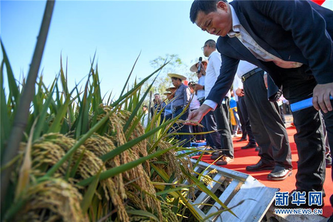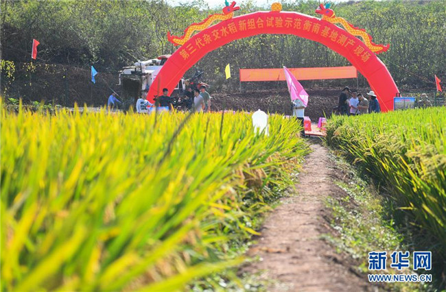 這是第三代雜交水稻新組合試驗(yàn)示范衡南基地測(cè)產(chǎn)現(xiàn)場(chǎng)待收割的水稻(10月21日攝)。 新華社記者 陳澤國 攝