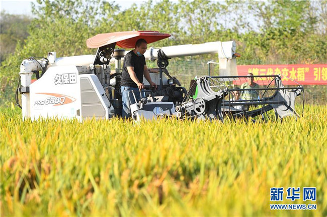 在第三代雜交水稻新組合試驗(yàn)示范衡南基地一塊被抽取測(cè)產(chǎn)的示范田里,工作人員進(jìn)行機(jī)械化收割測(cè)產(chǎn)(10月21日攝)。 新華社記者 陳澤國 攝