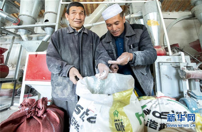 馬騰俊(左)和前來(lái)磨面的當(dāng)?shù)卮迕窆餐瑱z查新磨出的面(10月25日攝)。 新華社發(fā)(楊植森 攝)
