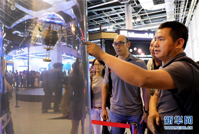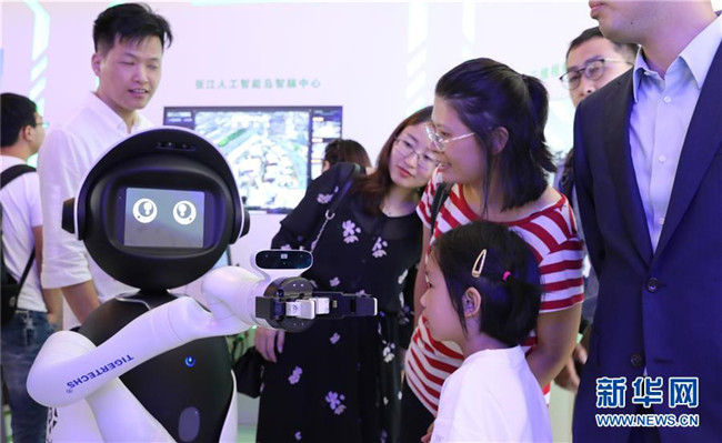 參觀者在上海舉行的2019世界人工智能大會上與一個智能機(jī)器人進(jìn)行交流(8月29日攝)。新華社記者 方喆攝