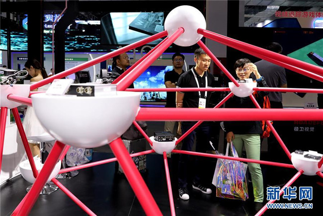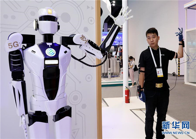 一名工作人員(右)在上海舉行的2019世界人工智能大會上演示一款基于5G網(wǎng)絡(luò)實現(xiàn)遠(yuǎn)程控制的機(jī)器人(8月29日攝)。新華社記者 方喆攝