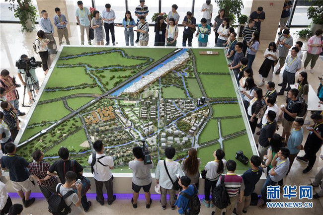 在上海臨港松江科技城沙盤(pán)前,參觀者聽(tīng)取建設(shè)規(guī)劃(8月13日攝)。 G60科創(chuàng)走廊是利用長(zhǎng)三角區(qū)位優(yōu)勢(shì)、良好的產(chǎn)業(yè)基礎(chǔ)和高校科研機(jī)構(gòu)集中等特點(diǎn)打造的區(qū)域協(xié)同創(chuàng)新發(fā)展的重要平臺(tái),將成為長(zhǎng)三角更高質(zhì)量一體化發(fā)展的重要引擎。新華社記者 金立旺 攝