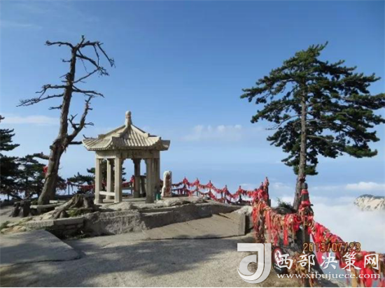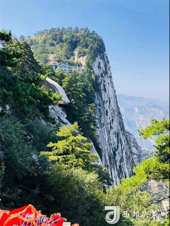 整個西峰為一塊渾然天成的巨石,北面臨空,懸崖絕壁如刀削鋸截,東西兩側(cè)狀如蓮花,因此也稱“蓮花峰”,這里更是“劈山救母”、“寶蓮燈”等傳說故事的發(fā)生地。
