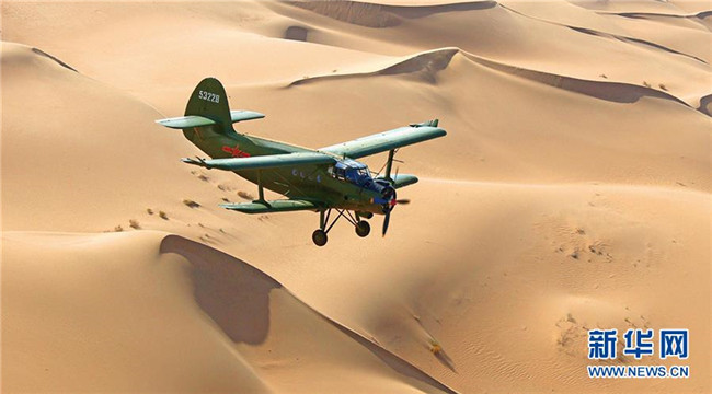 2018年,空軍運(yùn)-5飛機(jī)在沙漠上空進(jìn)行飛播造林作業(yè)。 新華社發(fā)(席博博 攝)