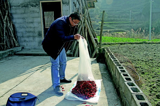 楊運(yùn)大到貧困戶家里走訪,幫助曬辣椒。