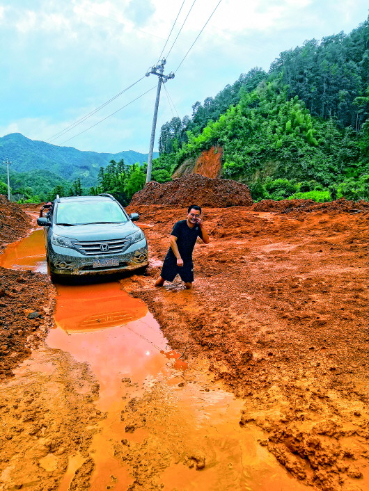 ▲瑤山突發(fā)泥石流,付昭成步行前往貧困戶家走訪。
