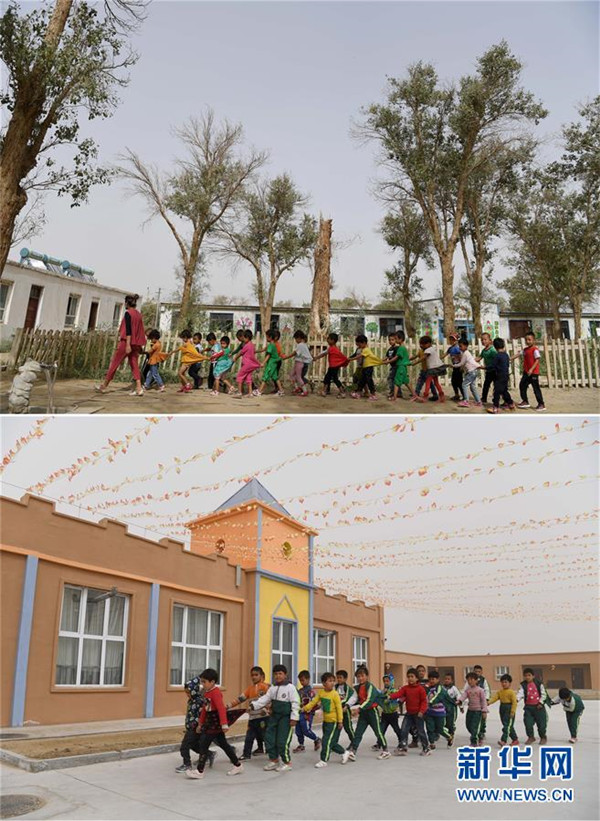 拼版照片:上圖為幼兒園學(xué)生走在易地扶貧搬遷前的于田縣達(dá)里雅布依鄉(xiāng)學(xué)校內(nèi)(2018年9月5日攝);下圖為幼兒園學(xué)生走在新校園內(nèi)(2019年3月20日攝)。