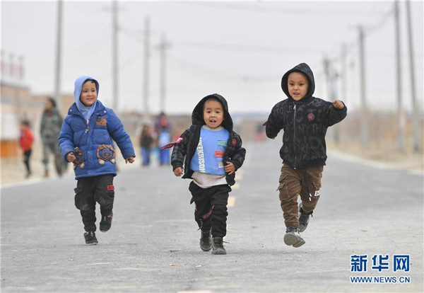 11月18日,幼兒園大班的小朋友放學(xué)后走在于田縣達(dá)里雅布依鄉(xiāng)易地扶貧搬遷安置點的硬化道路上。新華社記者胡虎虎攝