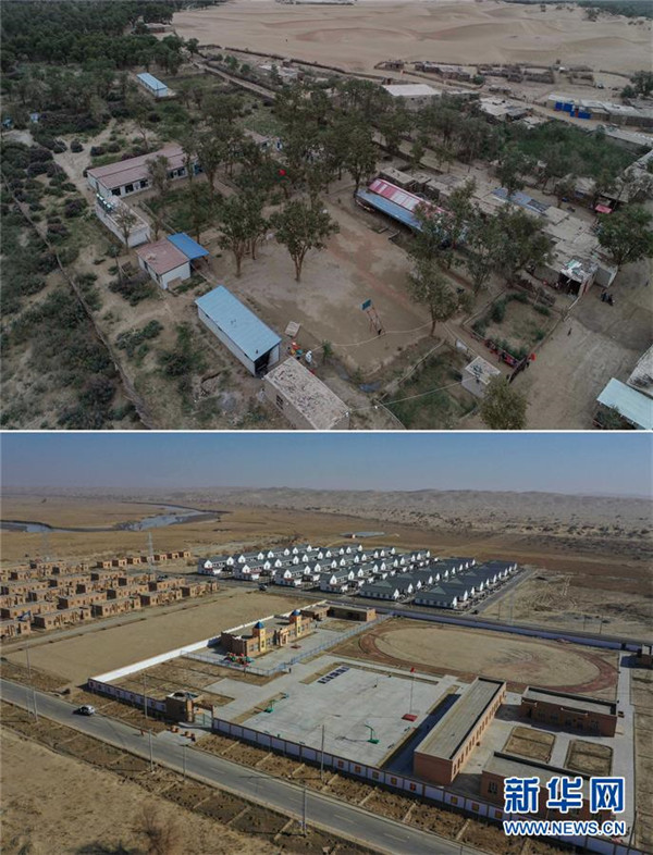 拼版照片:上圖為易地扶貧搬遷前的新疆于田縣達(dá)里雅布依鄉(xiāng)學(xué)校全景(2018年9月7日無人機拍攝);下圖為達(dá)里雅布依鄉(xiāng)易地扶貧搬遷安置點的學(xué)校新貌(2019年11月19日無人機拍攝)。新華社記者胡虎虎攝